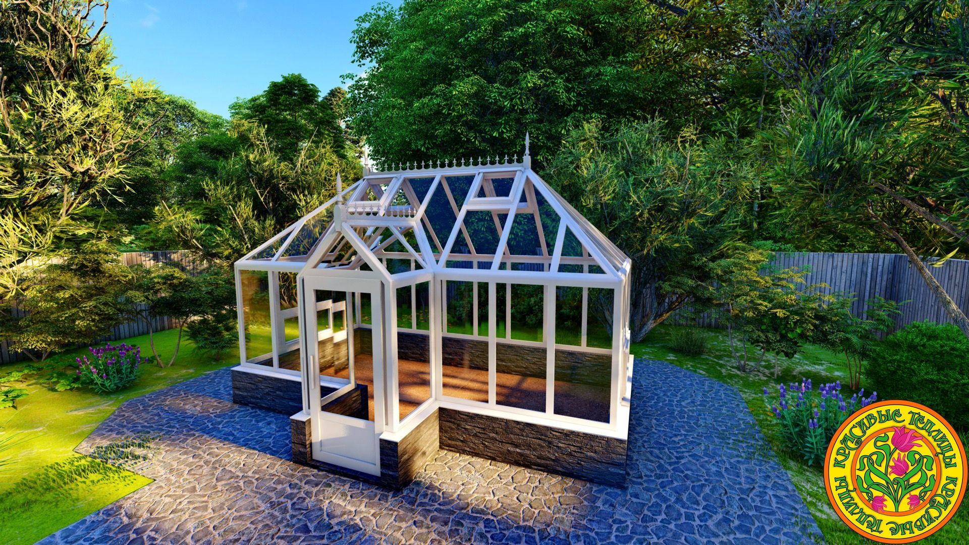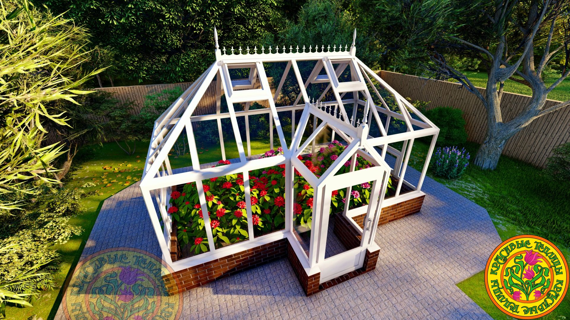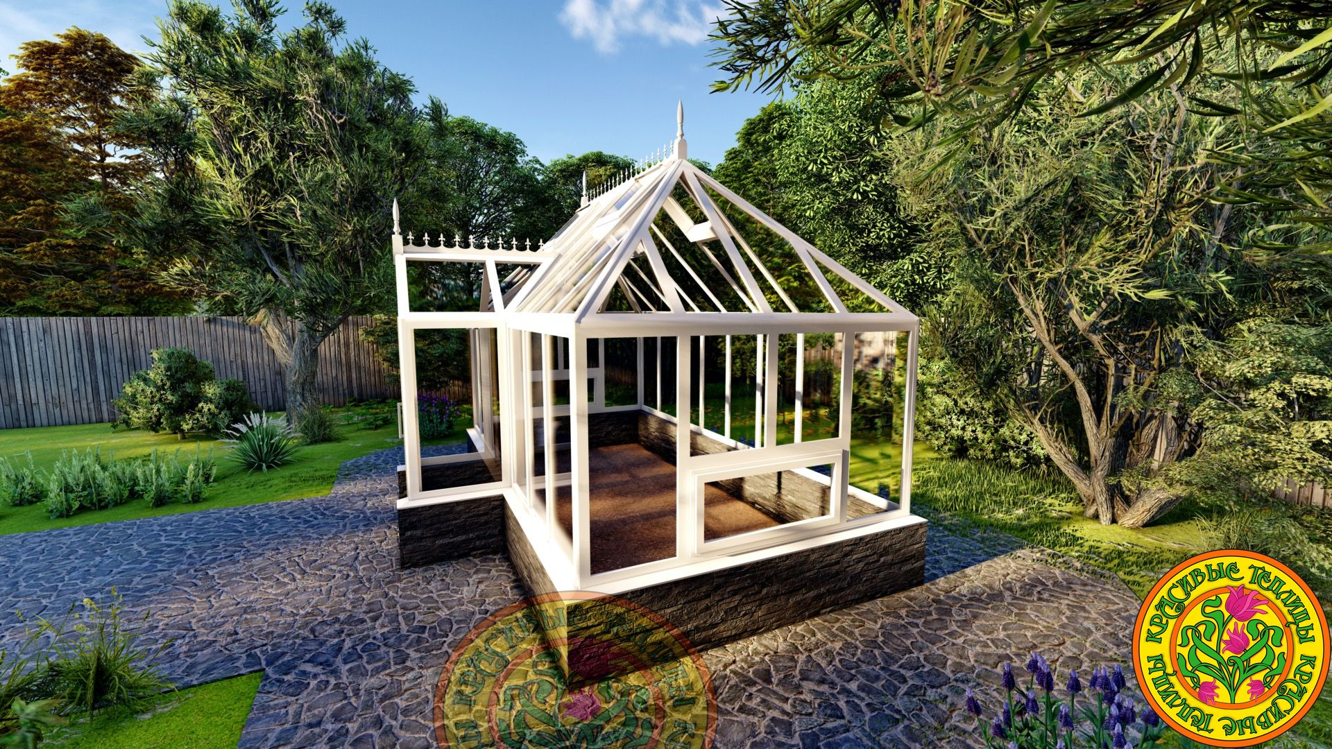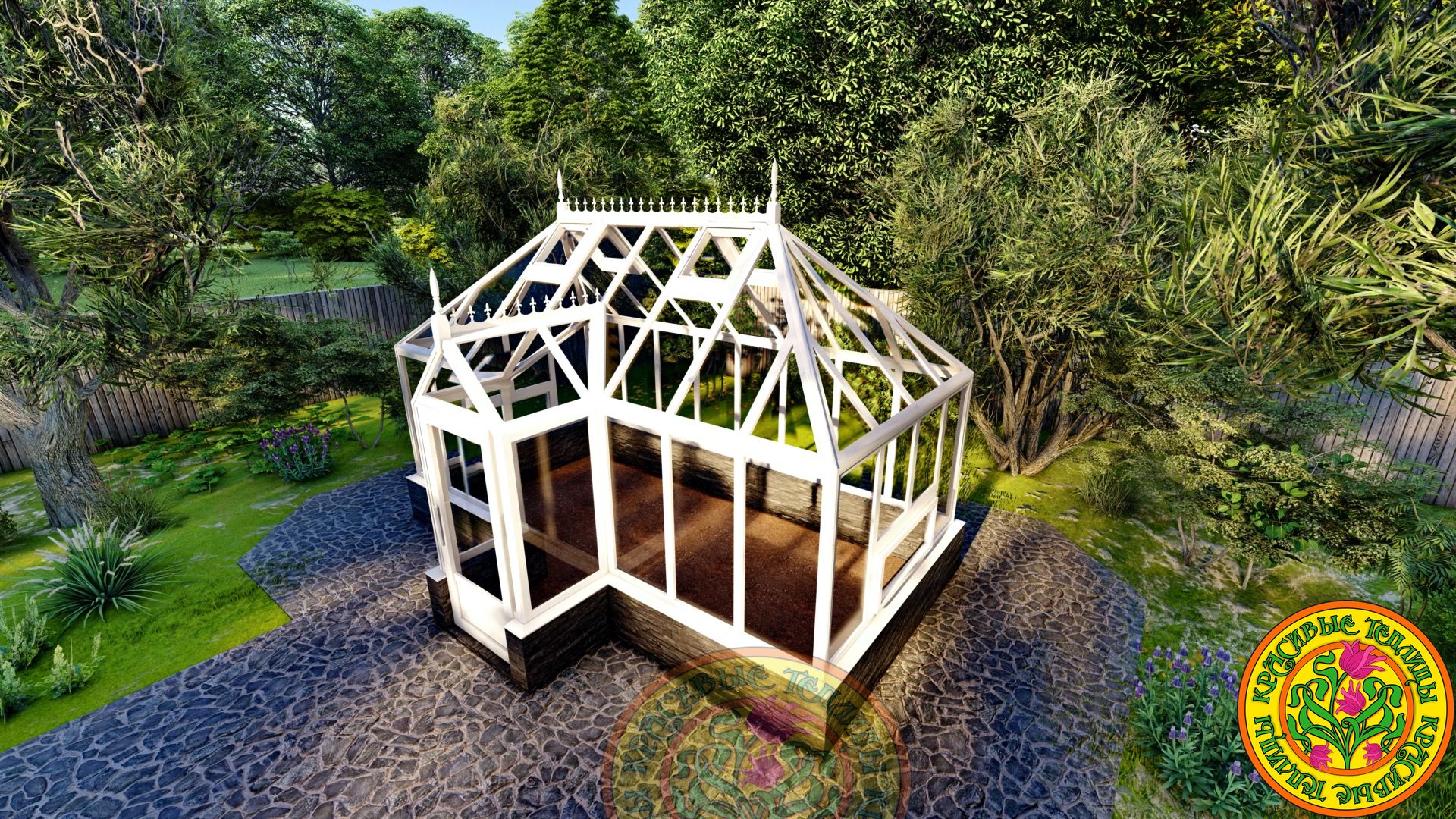Теплица имеет классический английский стиль с вальмовой четырехскатной крышей.
