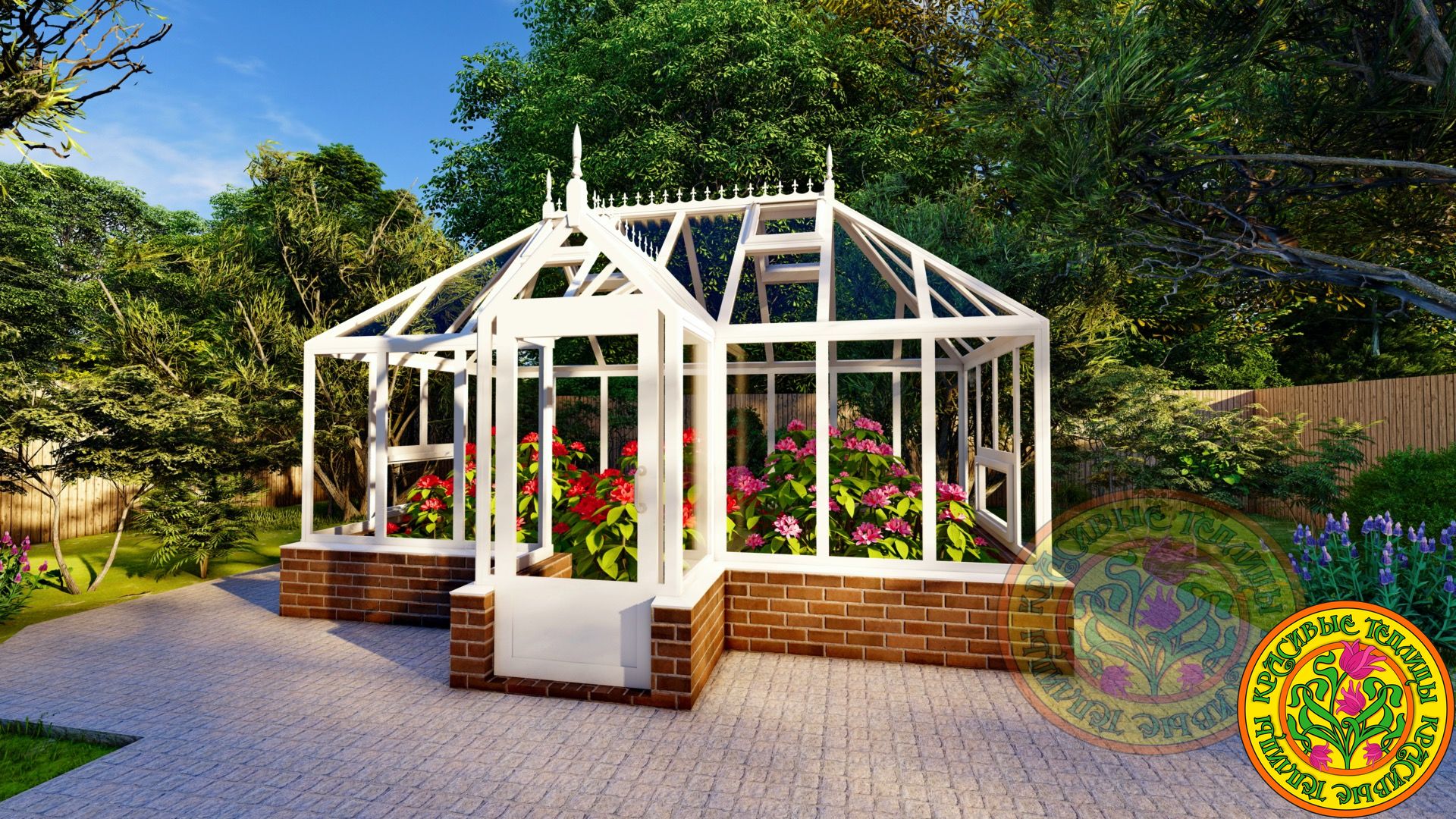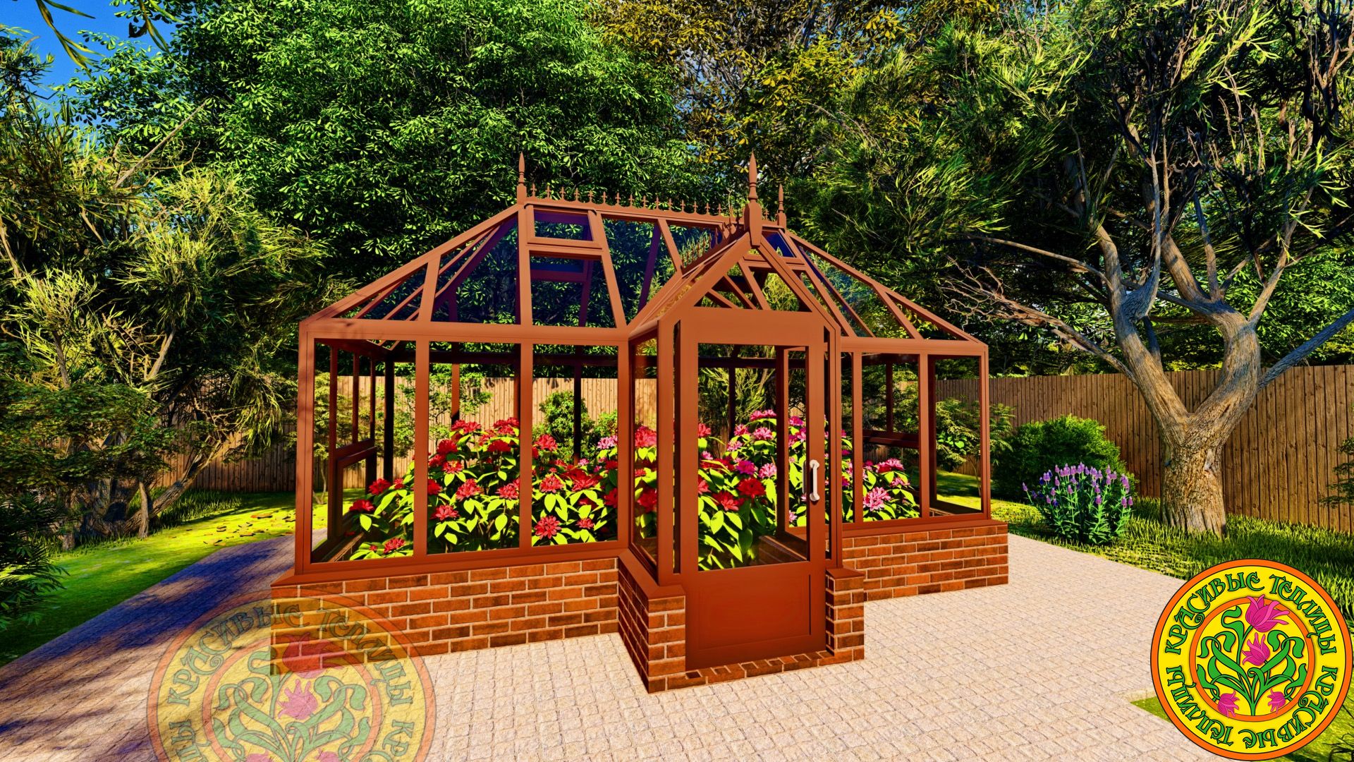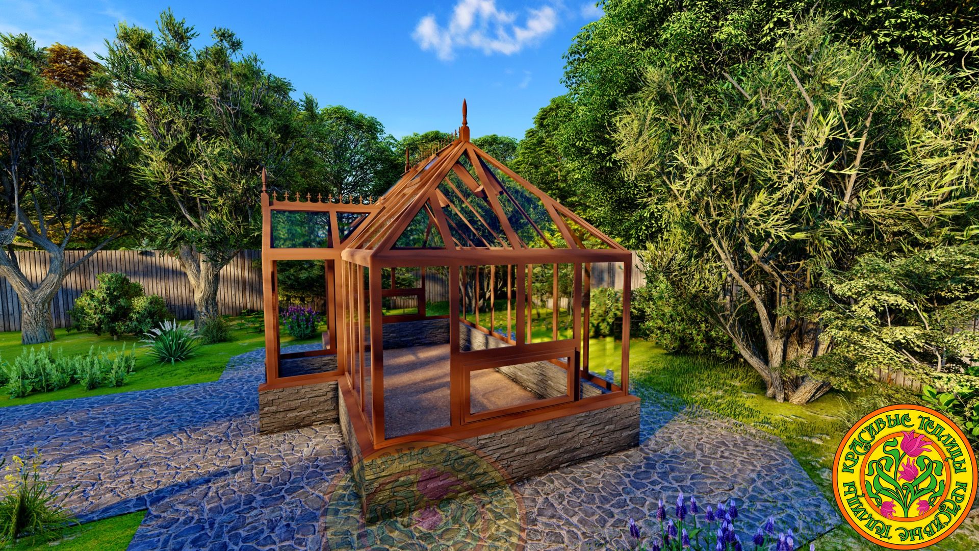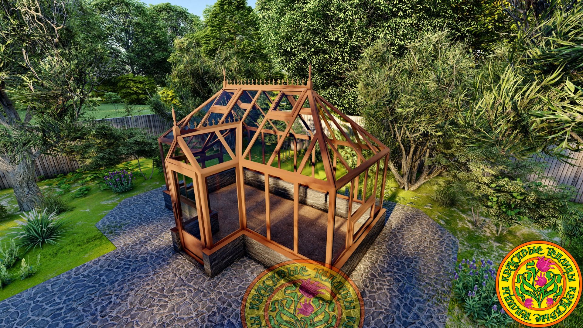 Теплица имеет классический английский стиль с вальмовой четырехскатной крышей.