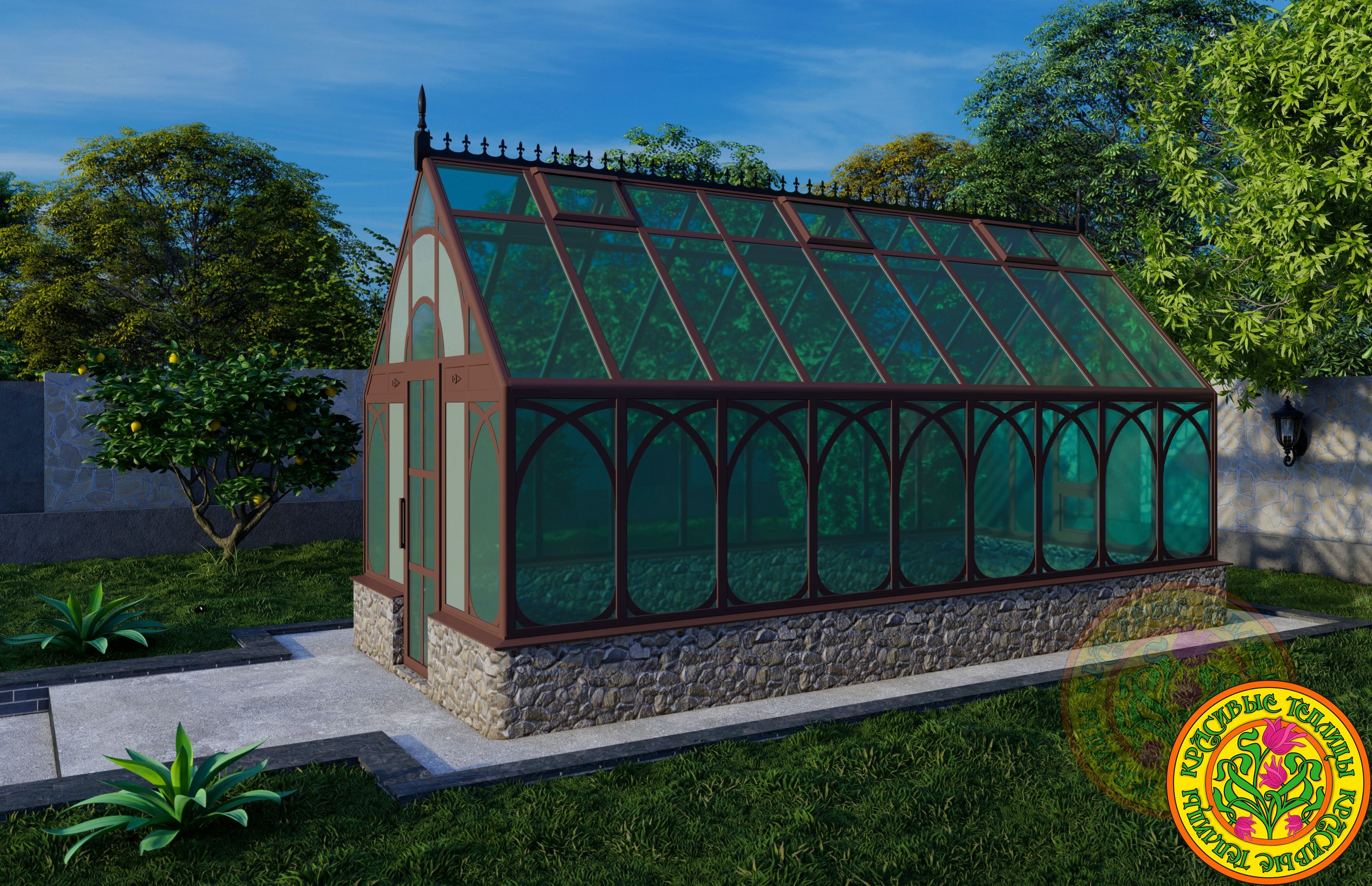 В данной модели применяются декоративные шпросы на стеклах вертикальных секций создающие неповторимый стиль данной конструкции. Созданный архитекторами компании Красивые Теплицы дизайн может претендовать на звание самой изысканной теплицы среди лучших мировых производителей этих стеклянных конструкций.