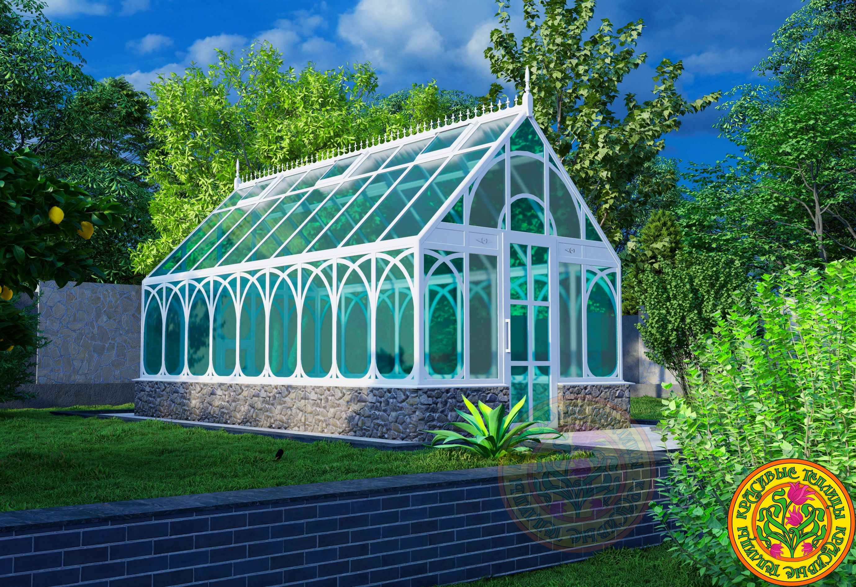 Дизайнерским решением служит частичное применение матового стекла в вертикальном остеклении, подчеркивающее грациозные линии фасадного декора конструкции теплицы