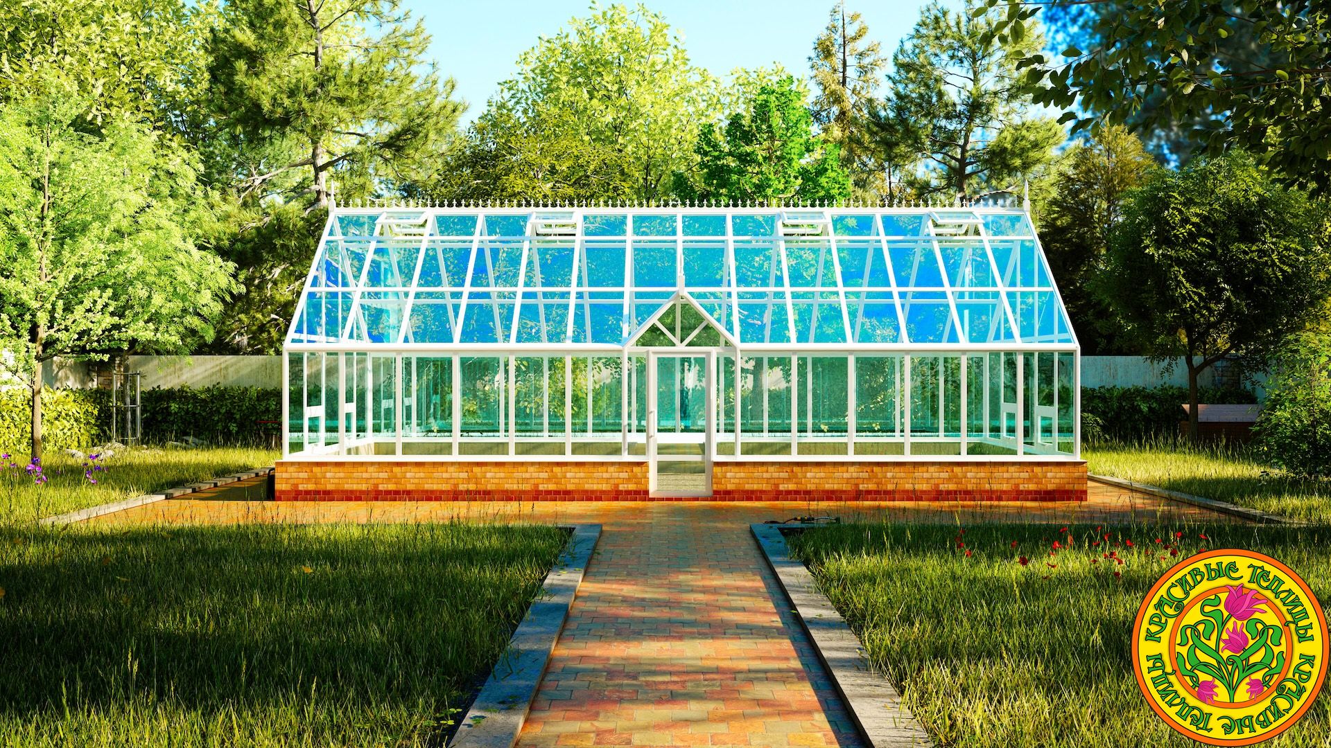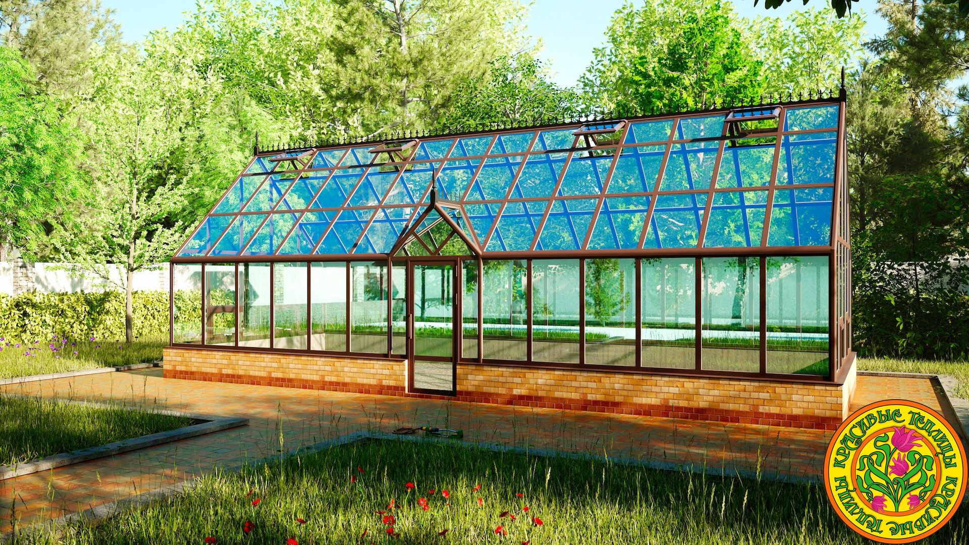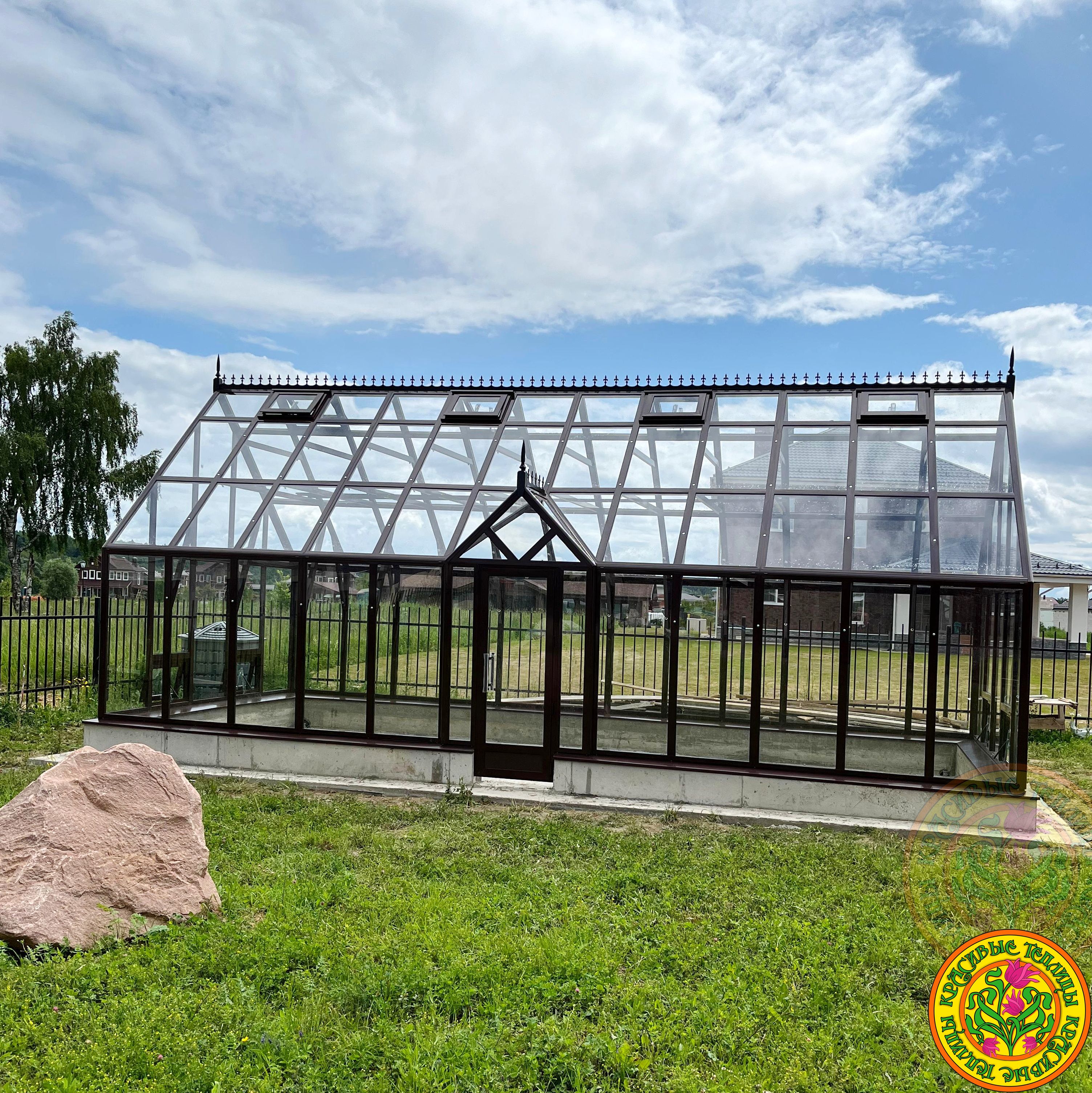 Фронтон придает теплице эстетичность английских архитектурных традиций. Конструкцию теплицы желательно собирать на бетонном или кирпичном фундаменте, заранее предусмотрев расположение грядок. Площадь пола в теплице 40 м.кв. открывает безграничные возможности в ее использовании.