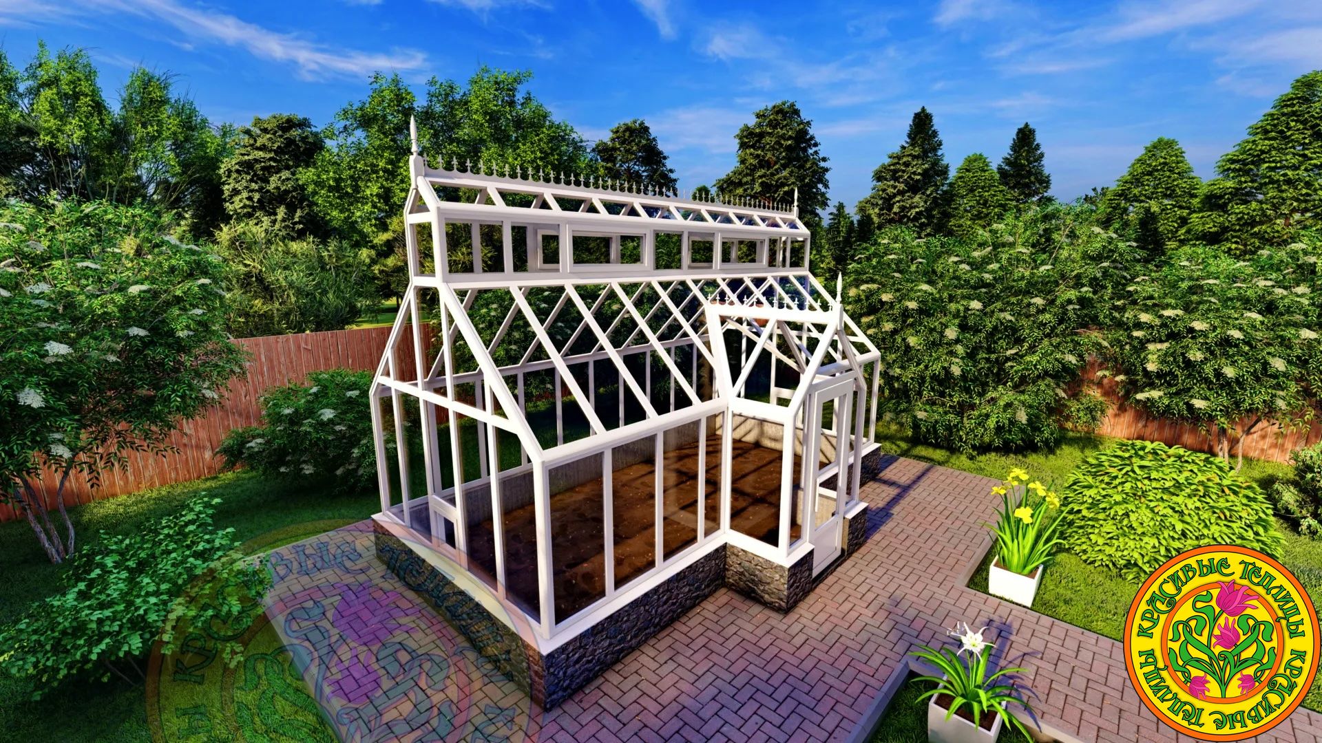 Теплица в изысканном английском стиле имеет важную отличительную особенность в виде двухуровневой двускатной кровли.
