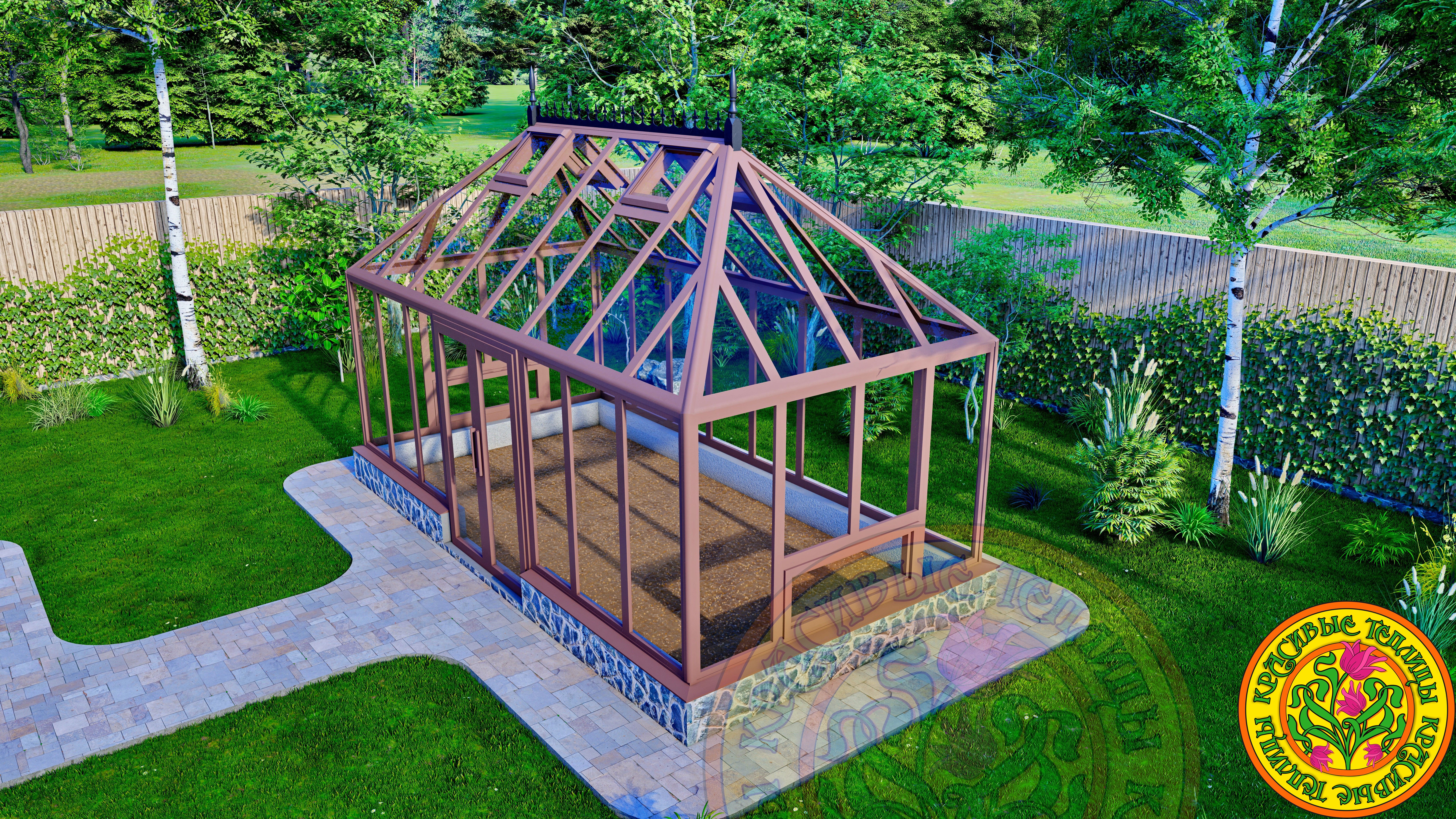 Теплица имеет классический английский стиль с вальмовой четырехскатной крышей.